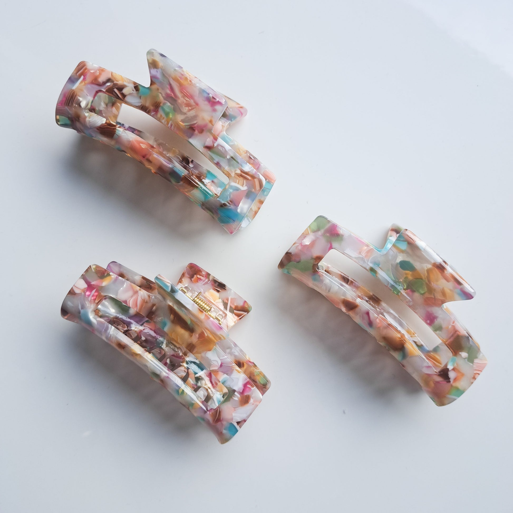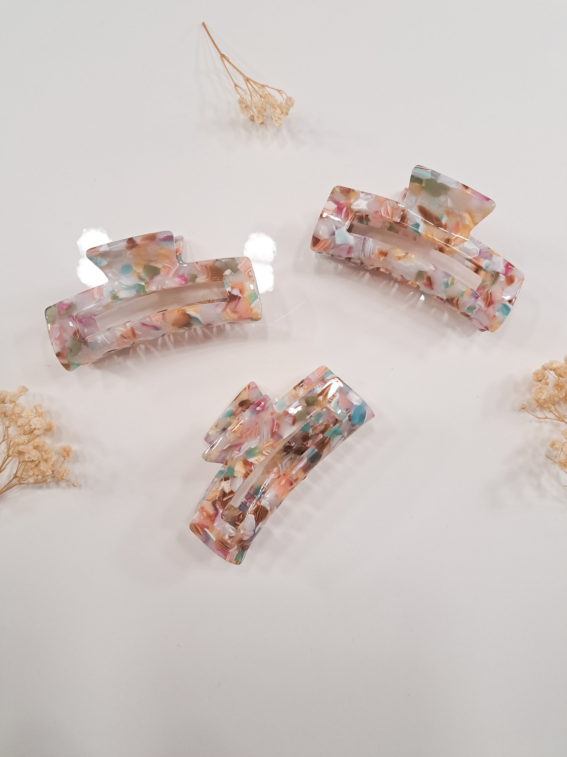Unsere hochwertigen Acryl-Haarclips sind die perfekte Kombination aus Stil und Funktionalität. Mit ihrem einzigartigen, marmorierten Design in sanften Pastellfarben setzen sie elegante Akzente und halten dein Haar sicher in Form.
