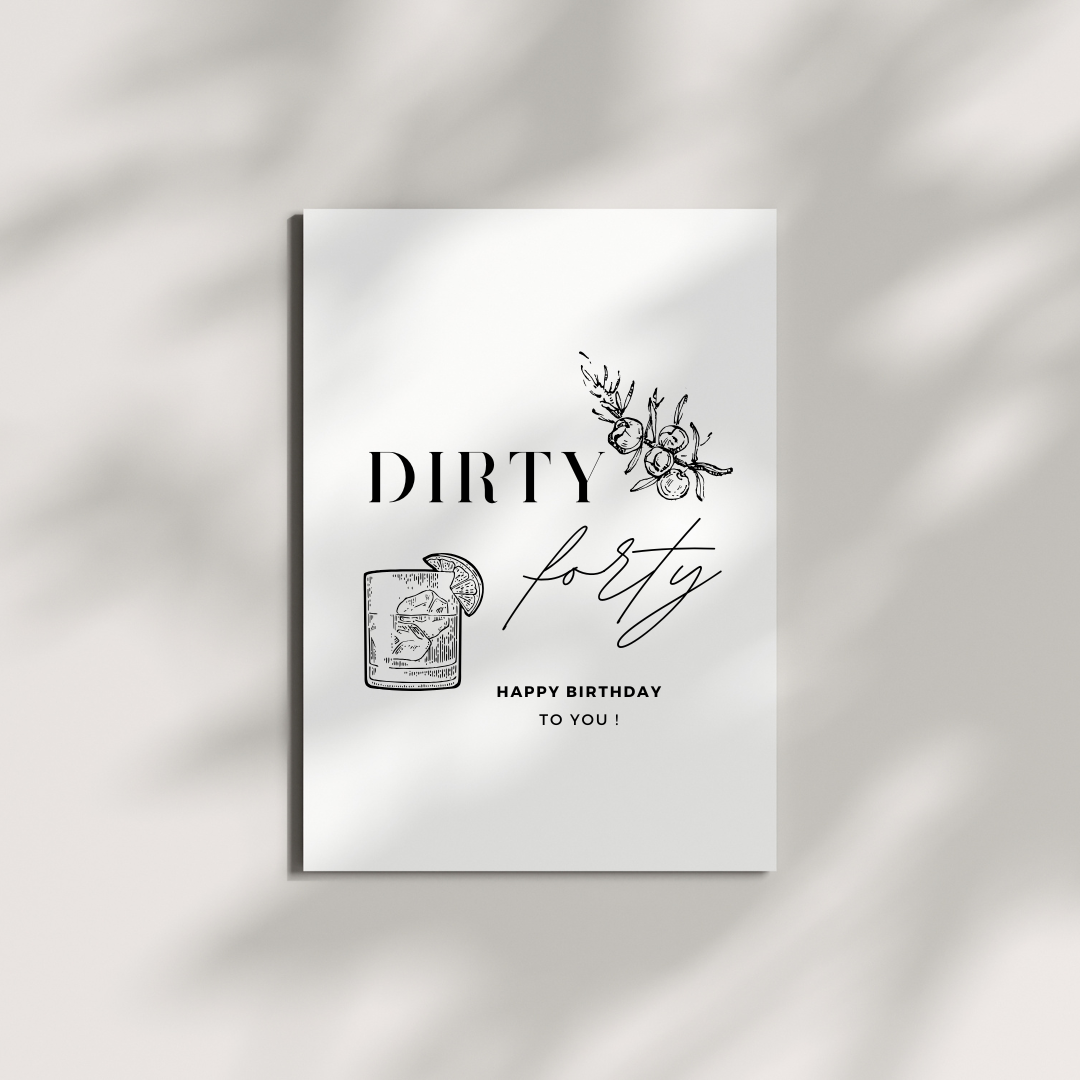 Die 40 ist das neue 30 – und das darf gefeiert werden! Diese elegante "Dirty Forty"-Karte ist die perfekte Wahl für alle, die diesen besonderen Meilenstein mit Stil begehen. Mit einem minimalistischen Design, einer feinen floralen Illustration und einem klassischen Cocktailglas-Motiv kombiniert diese Karte moderne Ästhetik mit einer Prise Humor.