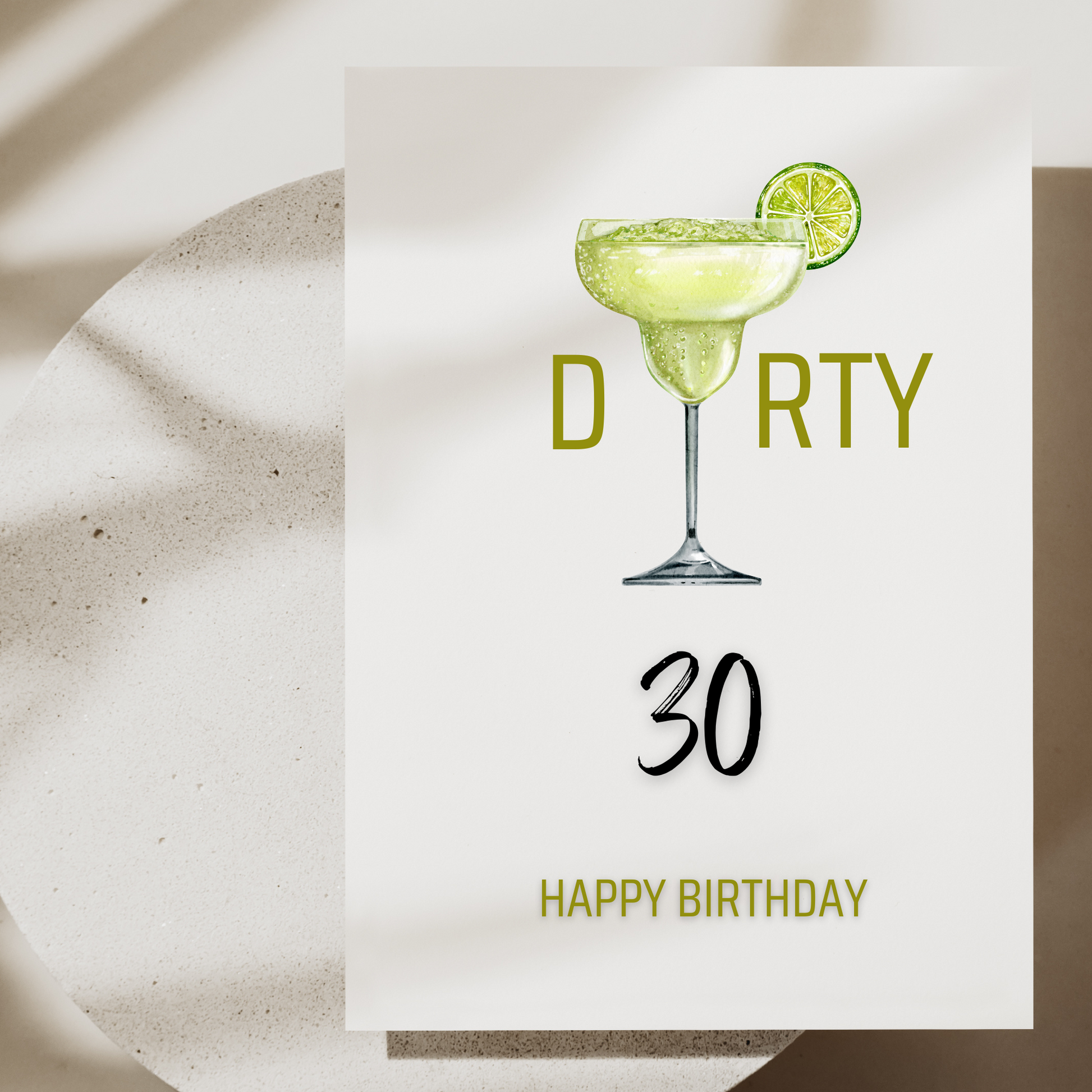 Feiere den 30. Geburtstag mit Stil – und einem Augenzwinkern! Unsere kreative „DIRTY 30“ Geburtstagskarte ist das perfekte Geschenk für alle, die gerne mit einem leckeren Cocktail auf den neuen Lebensabschnitt anstoßen.