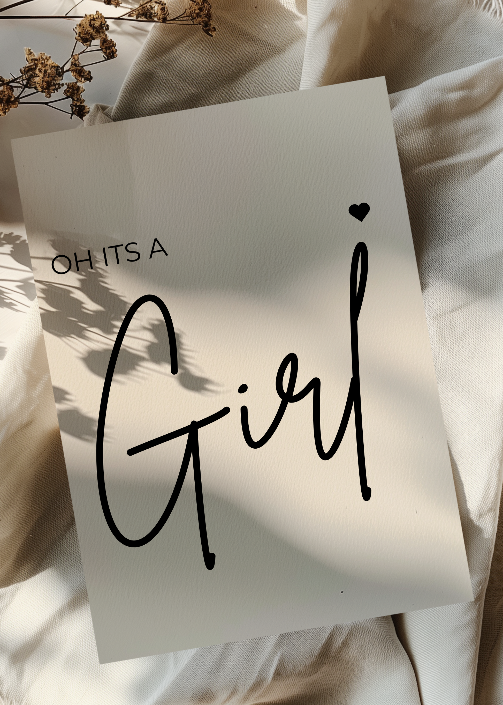 Feiere die Ankunft eines kleinen Wunders mit unserer liebevoll gestalteten Babykarte "Oh it's a Girl". Diese elegante Karte mit modernem, minimalistischem Design ist die perfekte Möglichkeit, die frohe Nachricht stilvoll zu verkünden.