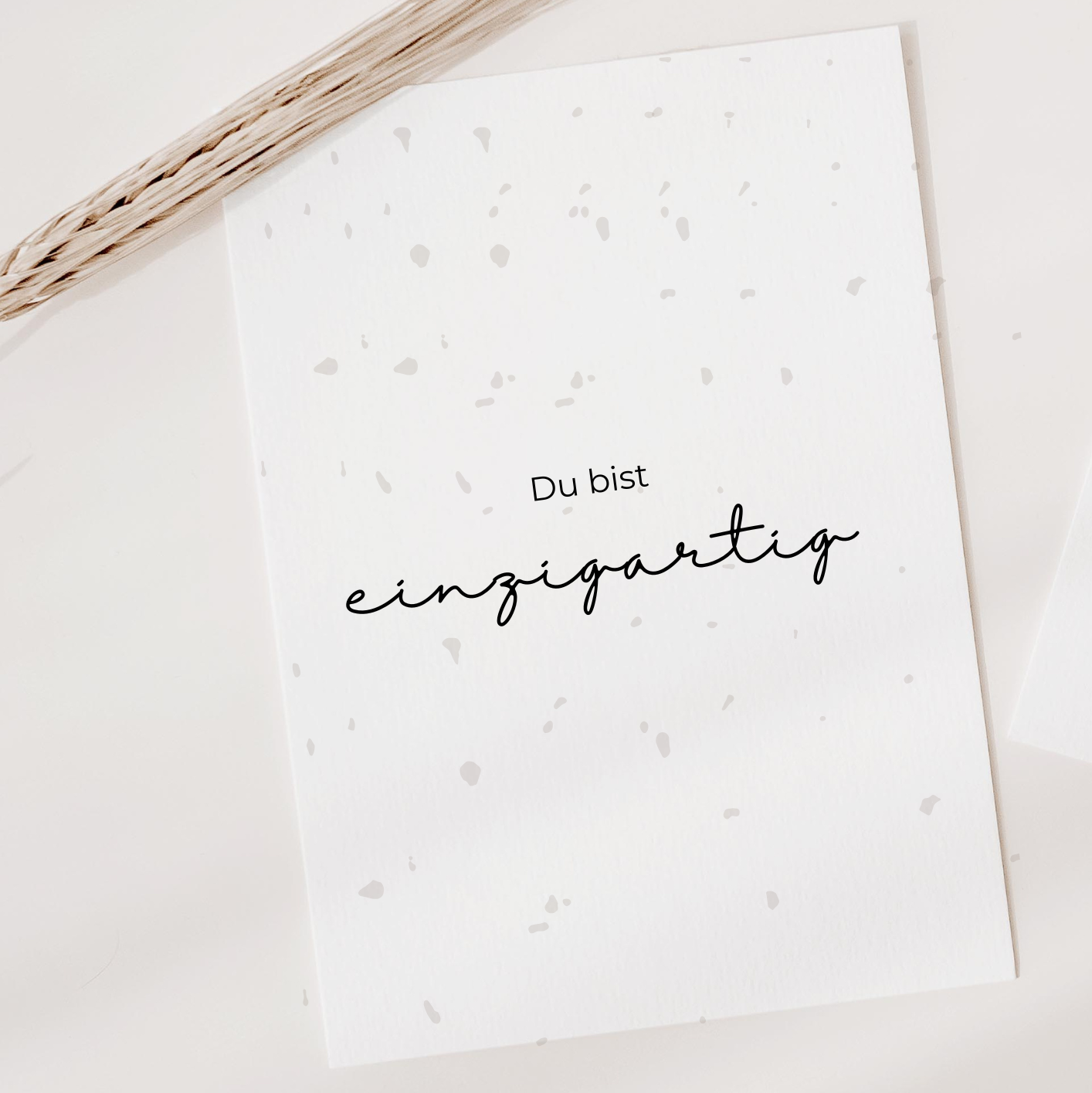 Verleihe einem besonderen Momenten eine persönliche Note mit dieser liebevoll gestalteten Postkarte im A6 Format. Der aufgedruckte Spruch „Du bist einzigartig“ erinnert an die Einzigartigkeit jeder Person und eignet sich perfekt als kleine, aber wertvolle Geste der Wertschätzung.