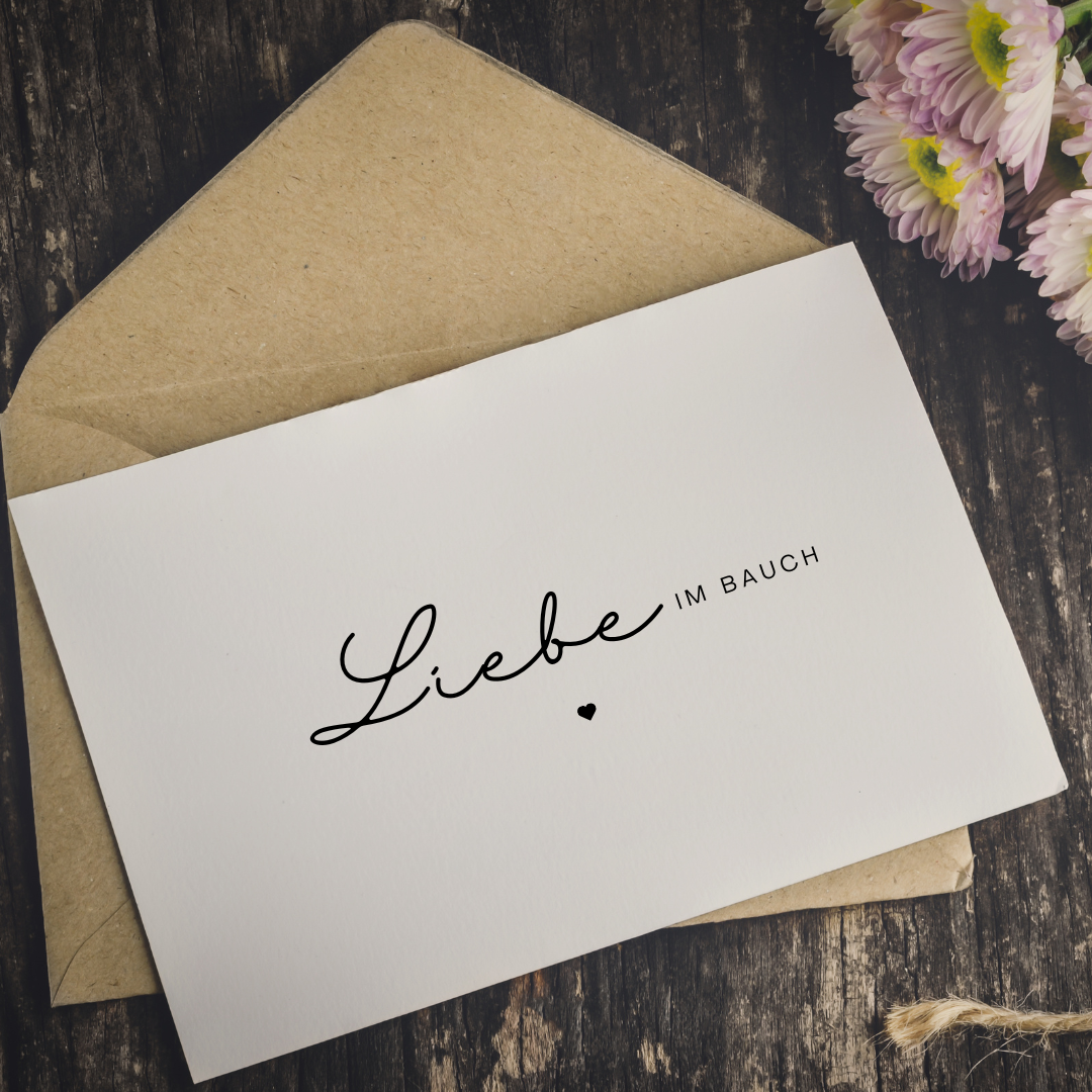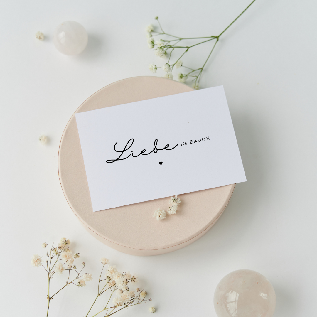 Diese liebevoll gestaltete Postkarte mit dem Schriftzug „Liebe im Bauch“ ist perfekt, um eine Schwangerschaft anzukündigen, Glückwünsche zu versenden oder einfach ein Lächeln zu verschenken.