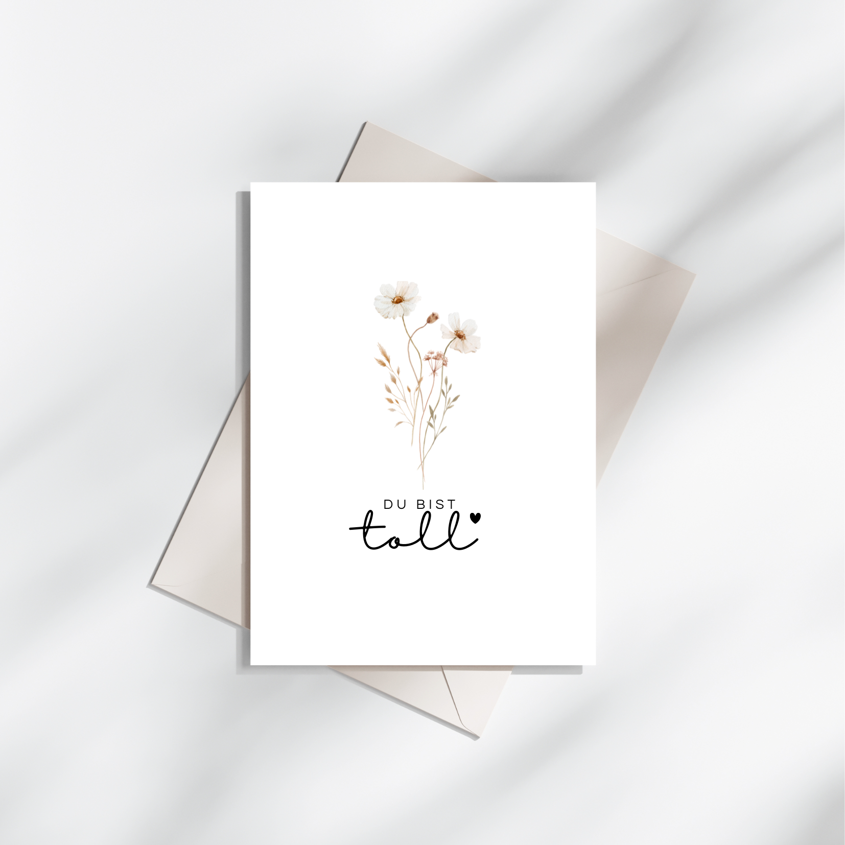 Minimalistische Postkarte „Du bist toll“ im Blumendesign