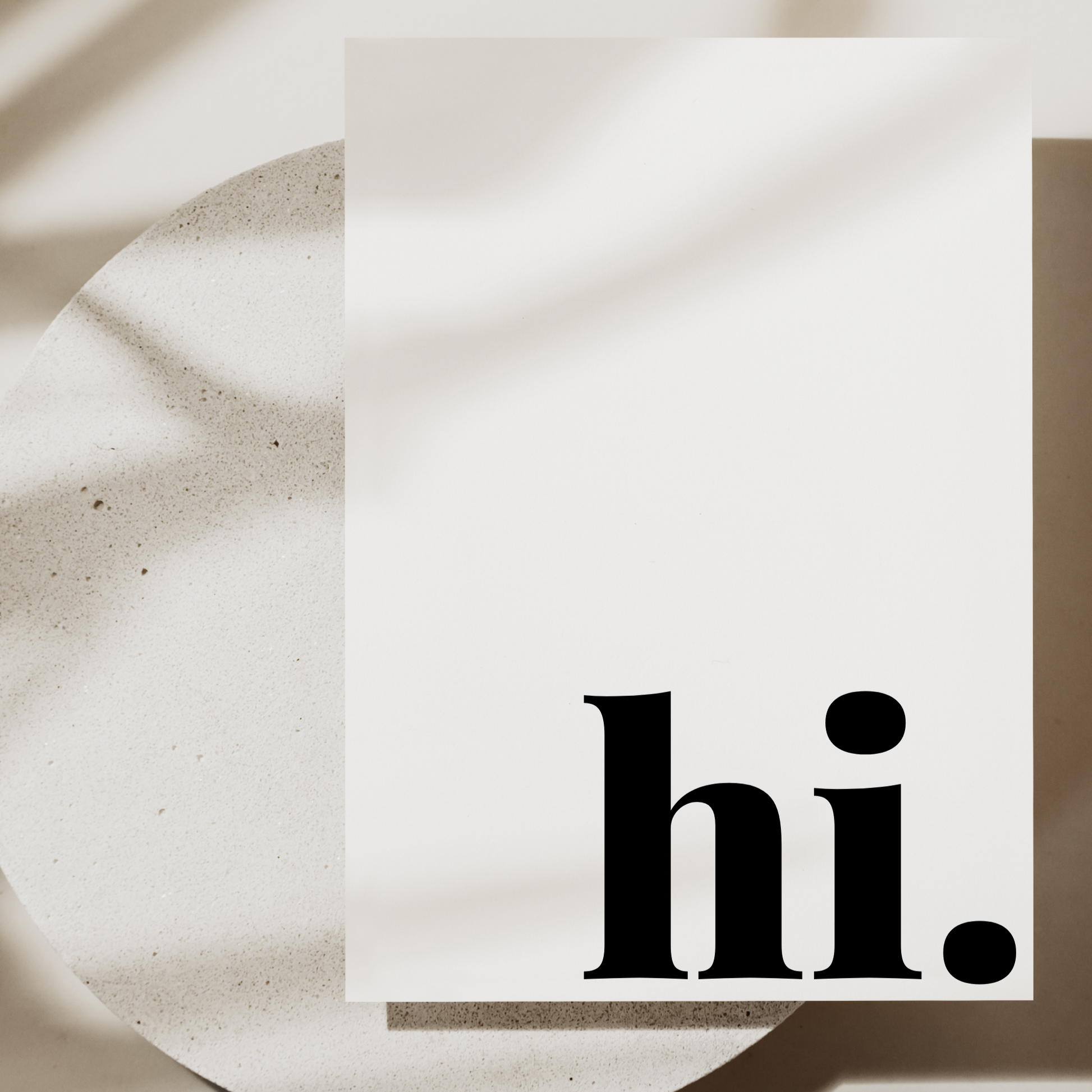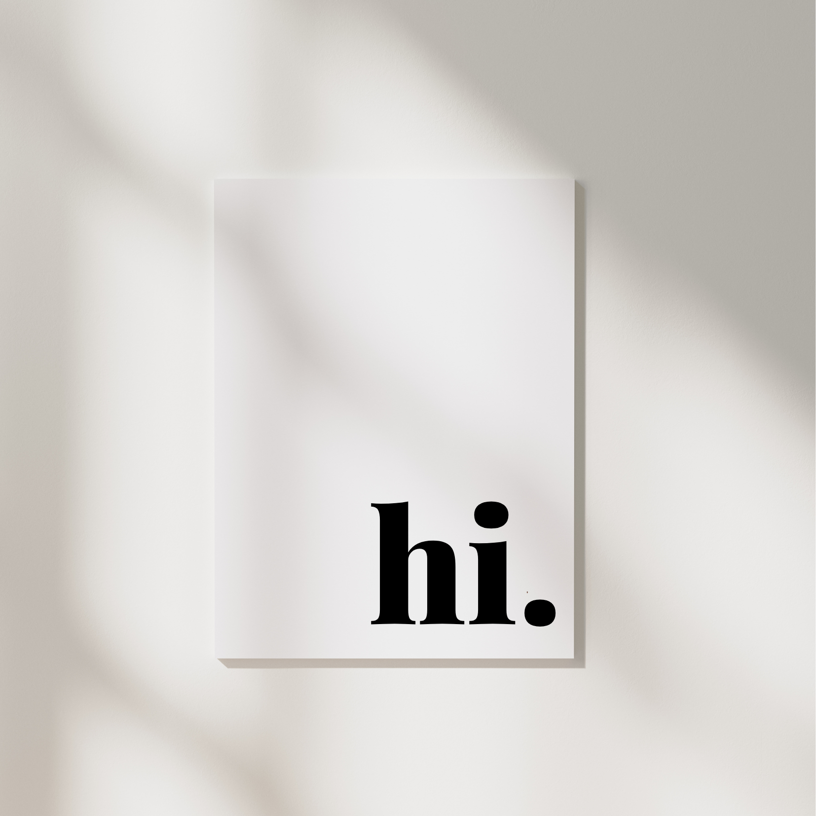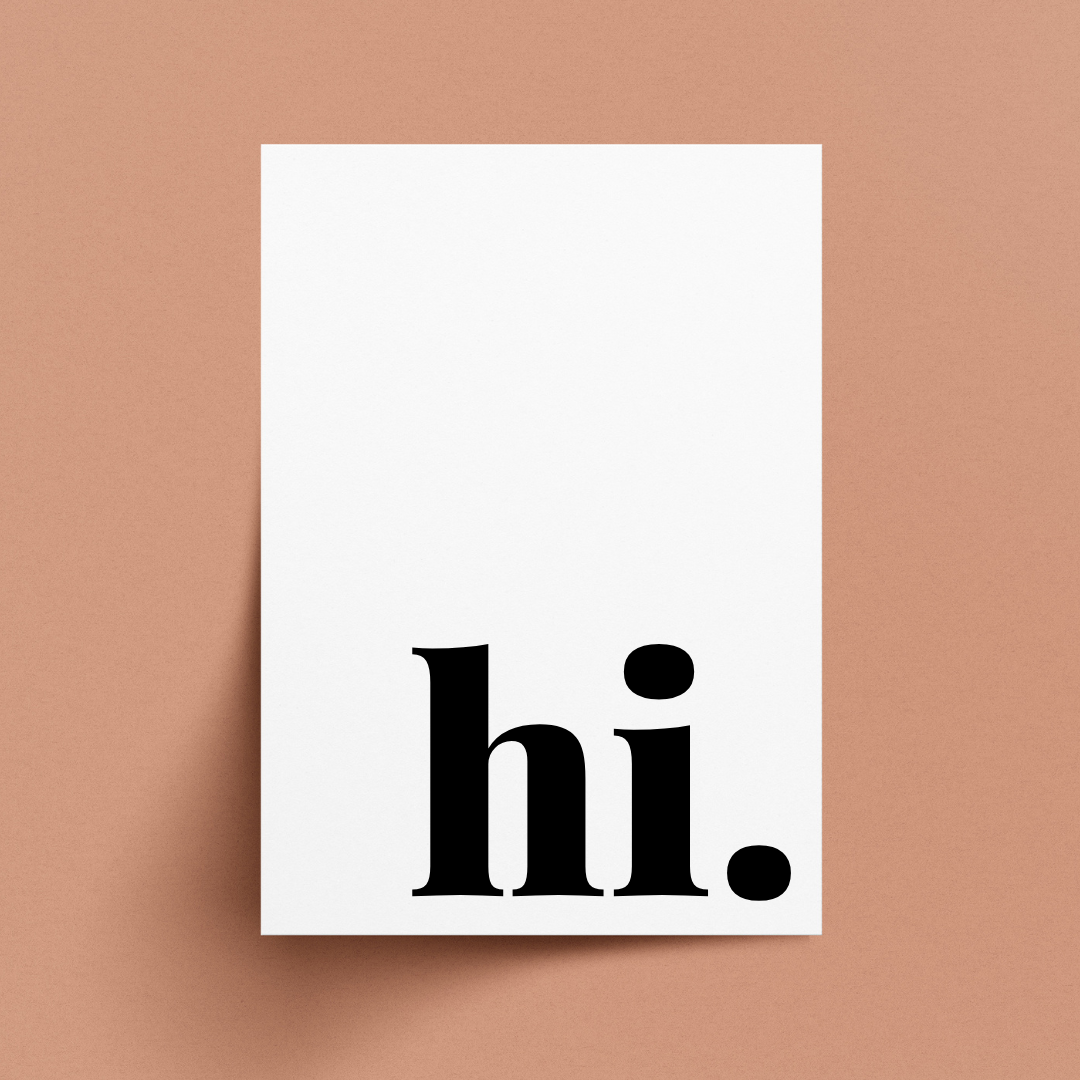 Verschenke ein freundliches "Hi" – mit dieser charmanten Postkarte aus hochwertigem Papier. Die minimalistische Gestaltung mit dem einfachen, aber aussagekräftigen Aufdruck "Hi" macht sie zum perfekten Gruß für jede Gelegenheit. Ob als spontaner Gruß an einen Freund, als Einladung oder einfach, um jemandem ein Lächeln ins Gesicht zu zaubern – diese Postkarte sorgt garantiert für Freude.