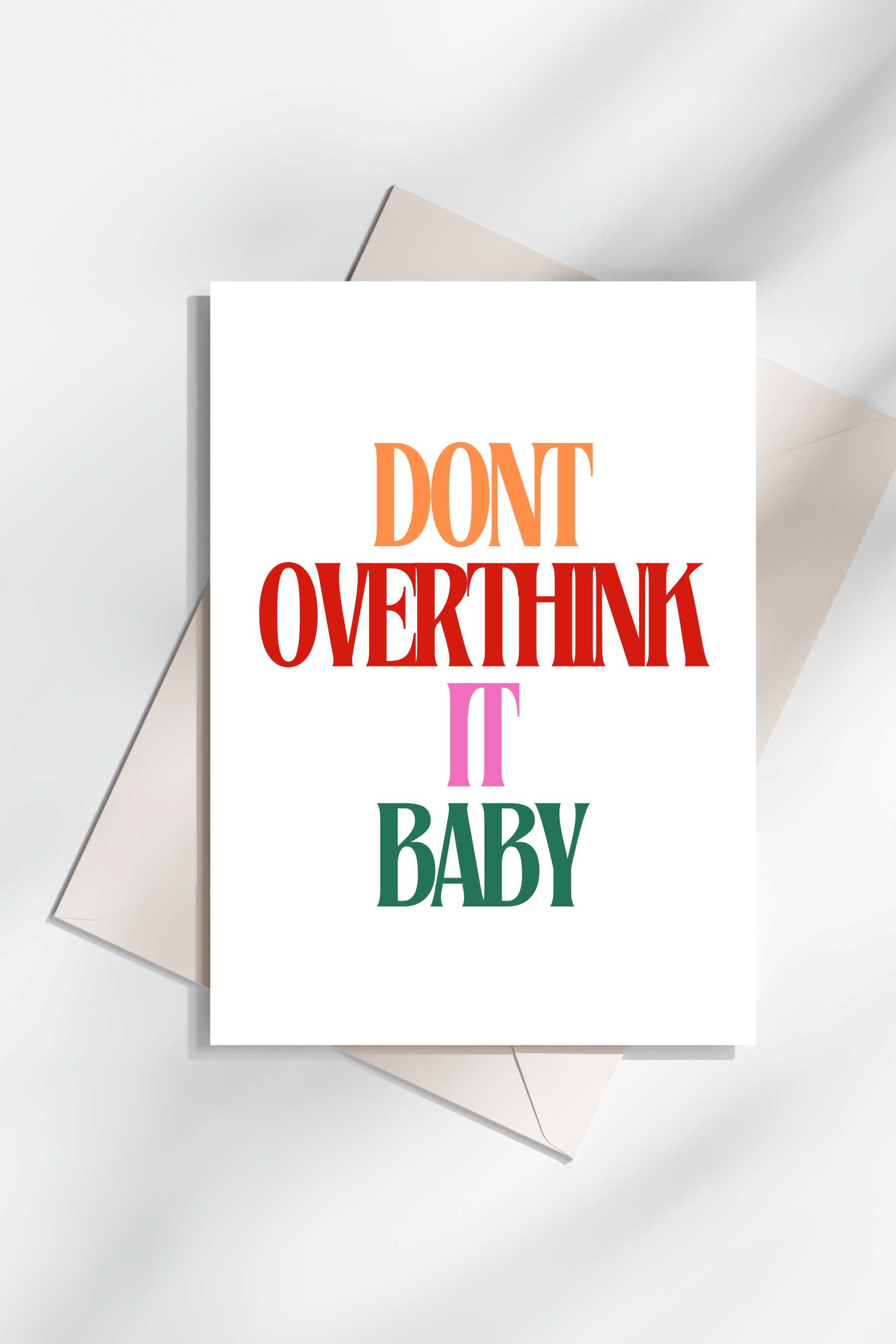 Manchmal braucht man einfach eine kleine Erinnerung daran, die Dinge locker zu sehen! Diese stylische Karte mit dem motivierenden Spruch "Don't Overthink It, Baby" ist perfekt, um jemandem Mut zu machen oder ihm ein Lächeln ins Gesicht zu zaubern.