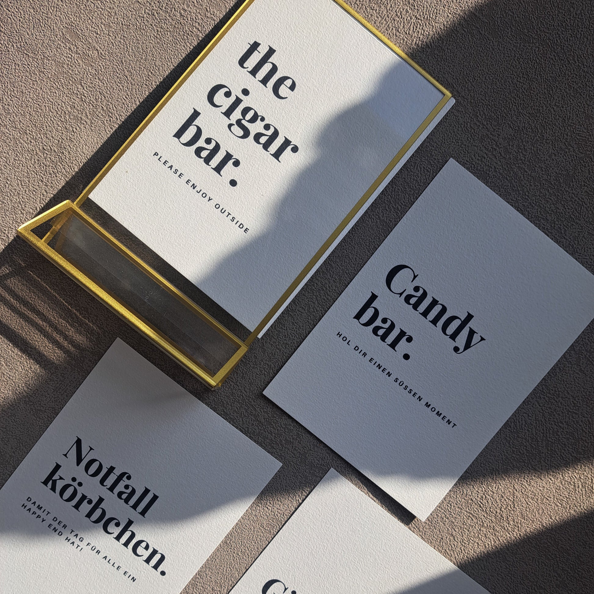 Verleihe deinem Event den letzten Schliff mit unseren einzigartigen Tischaufstellern, die für jede Feierlichkeit das richtige Ambiente schaffen. In unserem Online-Shop findest du stilvolle Tischaufsteller für die Candybar, das Notfallkörbchen, das Gästebuch und die Cigar Bar. Jeder Aufsteller ist nicht nur funktional, sondern auch ein echter Hingucker, der deinen Gästen in Erinnerung bleibt.